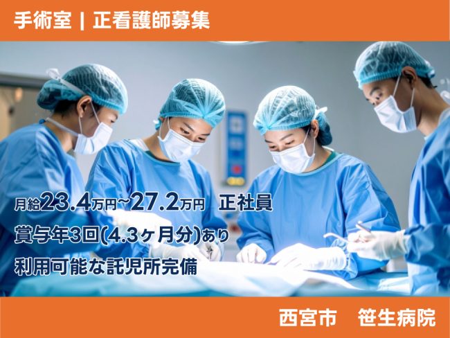 西宮市の病院で手術室の正看護師のお仕事|月給23.4万円~27.2万円|正社員|昇給あり|賞与年3回(4.3ヶ月分)あり|週休二日制