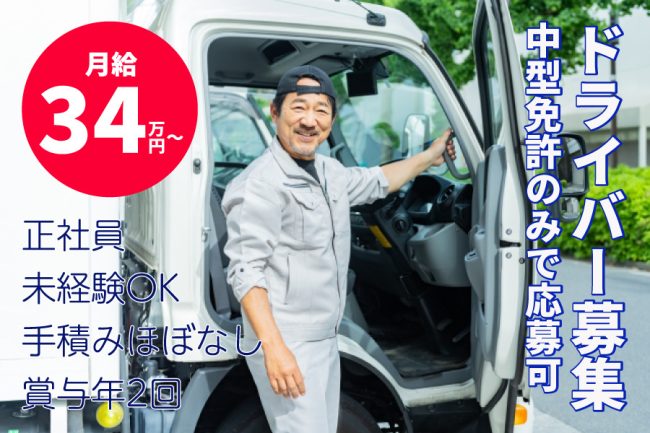 | 求める人材 | 【必須】 ・中型自動車運転免許 【歓迎】 ・フォークリフト免許 ・小型移動式クレーン免許 ・大型自動車運転免許 歓迎資格をお持ちでない方も 会社制度を使って取得が可能! その際の費用は全額会社負担なので ドライバー歴の浅い方や未経験の方、 20~30代の方も活躍できる環境です! |