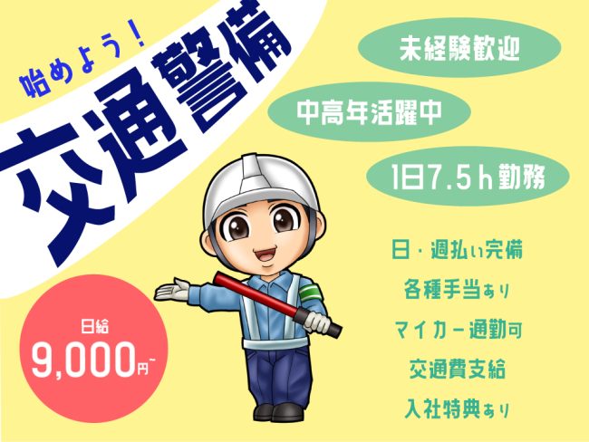 | 職種 | 1日7.5時間勤務!平松駅周辺で中高年活躍できる交通警備員正社員 |
