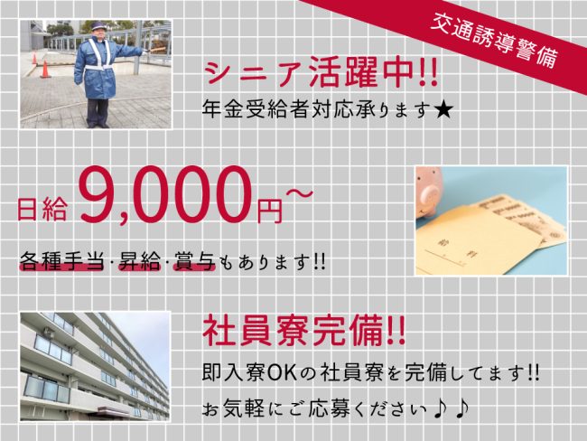 | 職種 | 定年後も働ける!八家駅周辺で中高年活躍できる交通警備員正社員 |