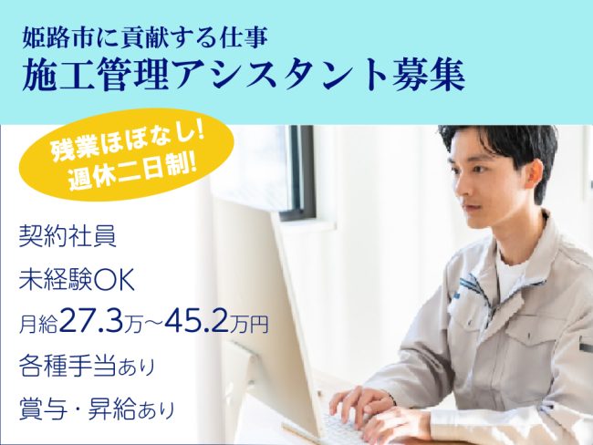 【契約社員】未経験者活躍中☆月給27.3万~45.2万円/週休2日制/手当多数あります♪/姫路市・設計・施工管理アシスタント作業!