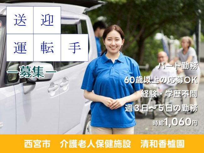 西宮市の介護老人保健施設で送迎運転手|普通免許OK|時給1,060円|パート|60歳以上応募可|1日1.5時間~3時間程度