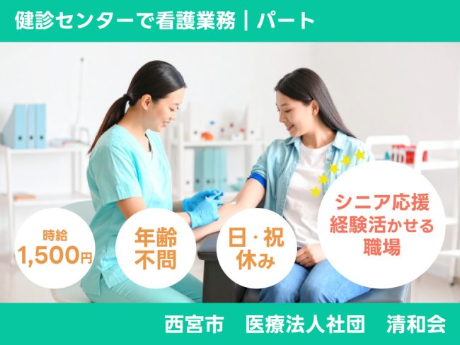 西宮市の健診センターで看護師|時給1,500円|パート|60歳以上応募可|1日4時間~7時間程度|日・祝休み