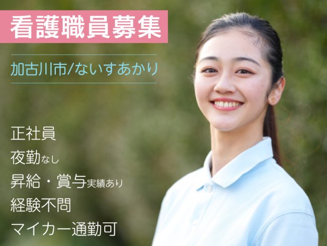 加古川市ないすあかりで看護職|正社員|月給23.9万円~26.6万円|昇給・賞与年3回3.8ヶ月分実績あり|夜勤なし|マイカー通勤可・無料駐車場あり
