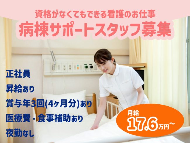 西宮市の病院で病棟サポートスタッフ|月給17.6万円~19.4万円|正社員|昇給・賞与(年3回4ヶ月分)あり|無資格OK|マイカー通勤可|残業ほぼなし