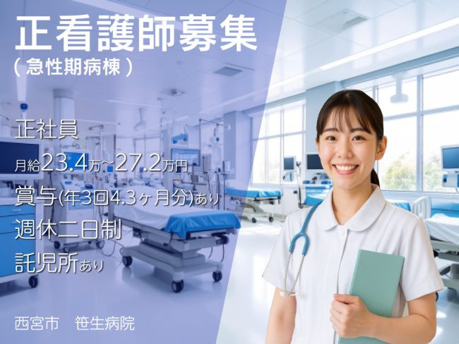西宮市の病院で急性期病棟の正看護師|月給23.4万円~27.2万円|正社員|昇給・賞与(年3回4.3ヶ月分)あり|夜勤で稼げる|マイカー通勤可|残業ほぼなし|託児所あり