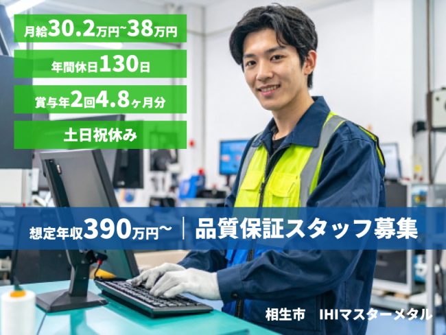 【IHIマスターメタルで品質保証スタッフ】正社員/相生市/月給30.2万円~/昇給・賞与(年2回4.8ヶ月分)あり/土日祝休み/年間休日130日
