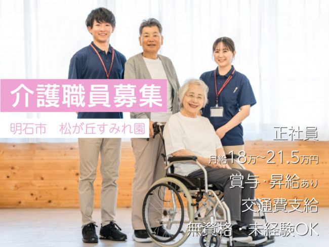 明石市の特別養護老人ホームで介護職|月給18万円~21.5万円|正社員|ブランクOK|無資格・未経験応募可|月9日休み|研修充実|昇給・賞与あり