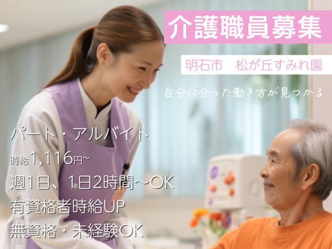 明石市の特別養護老人ホームで介護職|時給1,116円~|パート・アルバイト|有資格者時給UP|無資格・未経験可|1日2時間~OK|扶養内考慮あり|副業OK|制服貸与