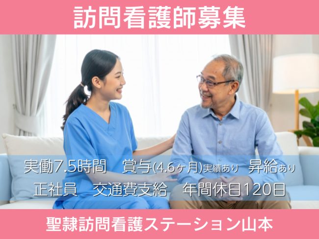 宝塚市の訪問看護ステーション山本で看護師|正社員|月給295,570円~|平日勤務|年間休日120日以上|賞与年3回4.6ヶ月実績あり|学歴・年齢不問|昇給あり|経験不問