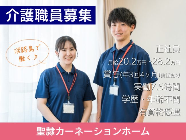 淡路市の特別養護老人ホームで介護職|無資格・未経験OK|月給202,700円~282,600円|正社員|年間休日120日|賞与年3回4ヶ月分以上|夜勤あり|昇給あり|年齢不問