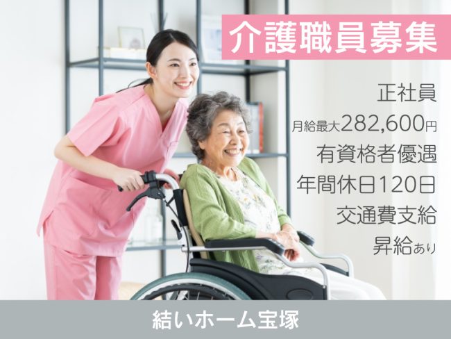 宝塚市の介護付有料老人ホームで介護職|有資格者優遇|月給202,700円~282,600円|正社員|年間休日120日|賞与年3回(4ヶ月分以上)支給|各種手当あり|昇給あり|見学可