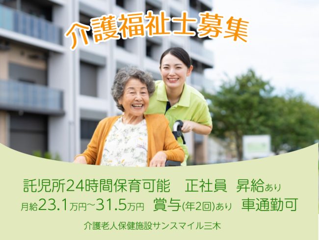 三木市の介護老人保健施設で介護福祉士|正社員|月給最大315,070円|昇給・賞与(年2回)あり|残業ほぼなし|マイカー通勤可|24時間保育可能な託児所あり|各種手当あり|交通費支給