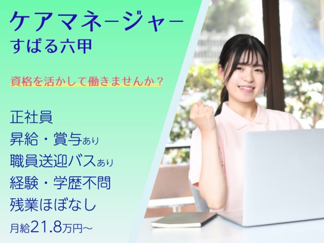 神戸市の介護老人保健施設でケアマネージャー|月給21.8万円~22.5万円|正社員|昇給・賞与あり|各種手当あり|職員送迎バスあり|経験・学歴不問|交通費支給|研修制度充実