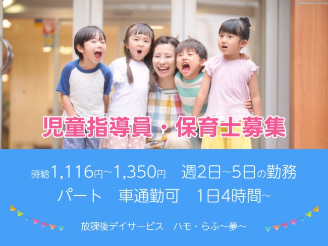 flag《急募》神戸市西区の放課後デイサービスで児童指導員・保育士|時給1,116円~1,350円|パート|年齢不問|週2日~5日の勤務|マイカー通勤OK|残業なし|交通費支給|運転免許必須|1日4時間~OK