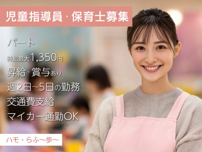 はりま求人ナビ > 求人情報 > 《急募》明石市の放課後デイサービスで児童指導員・保育士|時給1,116円~1,350円|パート|年齢不問|週2日~5日の勤務|マイカー通勤OK|残業なし|交通費支給|駅チカ通勤楽々|1日4時間程度OK