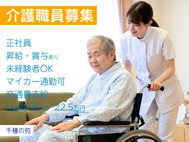 | 仕事内容 | 『特別養護老人ホーム 千種の苑』で利用者さんの身体に直接触れて、身の回りのお世話をする『身体介護』の業務。(70人)具体的には、お風呂で洗髪や洗身をする「入浴介助」、トイレでの介助やオムツ交換をする「排泄介助」、ベッドから車いす、車いすからトイレなどへの移動を援助する「移乗介助」、「食事介助」、「更衣介助」などがあります。 また、負担の大きい夜勤については、夜勤明けは勤務がなく(非番)、その次の日は必ず公休としており、心身の負担は少なめです。 【このお仕事の魅力】 ・学歴、経験不問です ・残業ほとんどありません ・転勤がなく安定してお仕事できます |