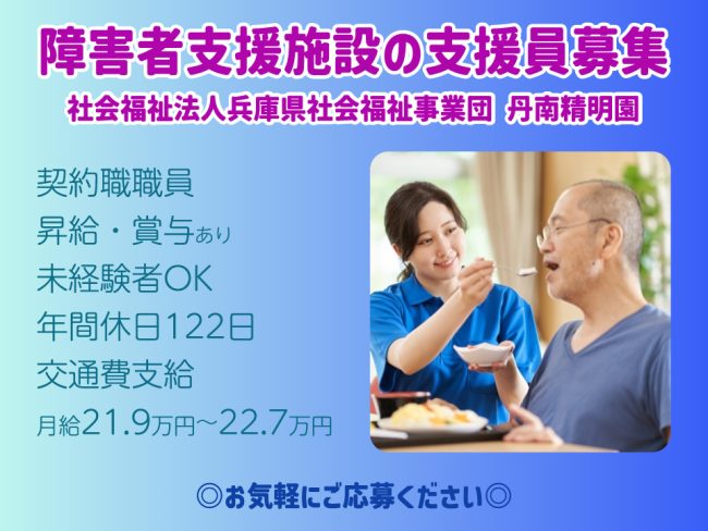 丹波篠山市の障害者支援施設で支援員|月給21.9万円~22.7万円|契約職職員|経験・学歴不問|年間休日122日|残業ほぼなし|資格受験サポートあり|交通費支給|昇給・賞与あり