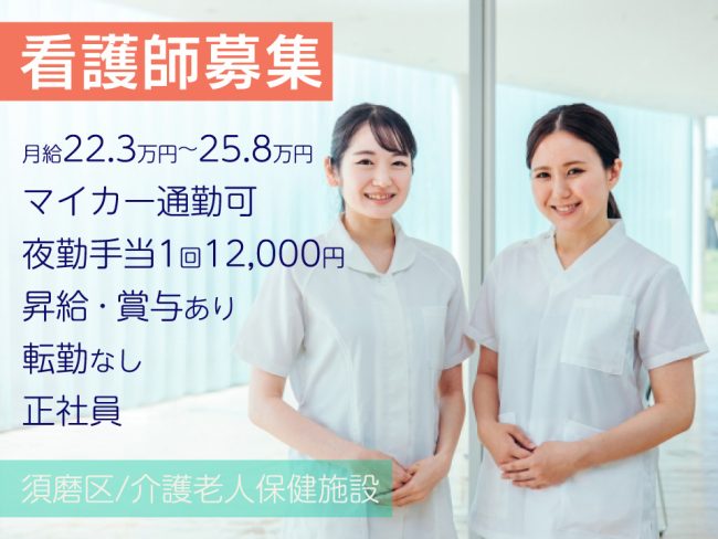 神戸市の介護老人保健施設で看護職員|月給22.3万円~25.8万円|正社員|学歴不問|昇給・賞与あり|転勤なし|社会保険完備|交通費支給|残業なし