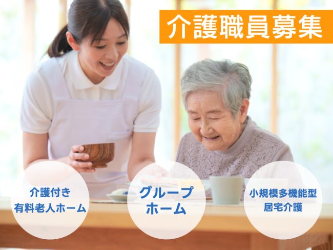 | 仕事内容 | シニアライフコート潮芦屋内の入居者及び利用者の生活介護 1)介護付有料老人ホーム 2)グループホーム 3)小規模多機能型居宅介護 ※グループホームは調理あり |