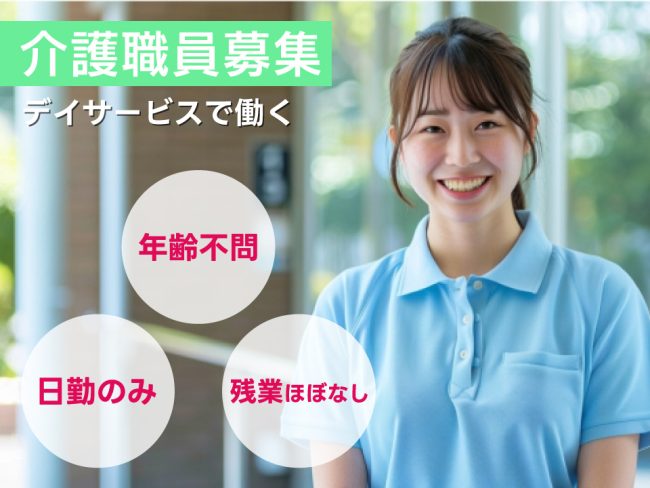 | 仕事内容 | ◇デイサービスをご利用になる高齢者等の介護を行います。 *主な介護は、利用者の ・日常支援:レクレーション、掃除、洗濯 ・身体介護:食事、入浴、排せつ、衣類の脱着、身体清拭 ・送迎補助業務(運転は行いません。) などのお世話をします。 *介護の経験及び資格がなくてもできるお仕事です。 【このお仕事の魅力】 ・希望休は月に4日まで取得できますので、ご家庭のご都合にあわせてお仕事をしていただけます。 ・残業ほぼなし ・マイカー通勤できます。 ・45日間の研修期間があるので不安なくお仕事をスタートできます。 |