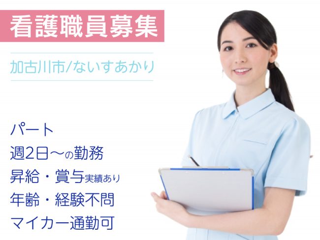 加古川市ないすあかりで看護職|パート|時給1,450円~1,650円|昇給・賞与実績あり|週2日~4日の勤務|年齢・経験不問|マイカー通勤可・無料駐車場あり