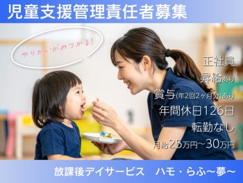 放課後デイサービスで児童支援管理責任者業務をお任せします...給与 月給 250,000円〜300,000円 交通 JR明石駅から車12分 勤務時間 10:00~19:00
